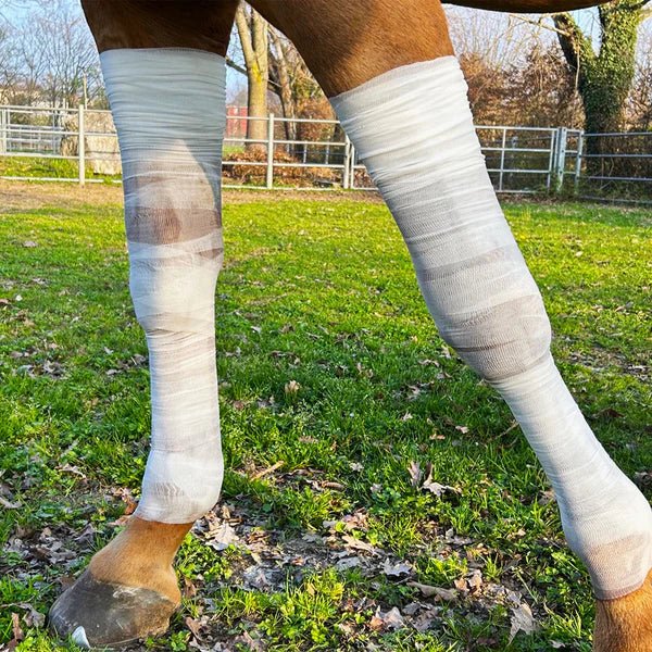 Bendaggi pronti all’uso pensati per favorire il drenaggio dei liquidi e ridurre i gonfiori degli arti, supportando la circolazione e il recupero post-lavoro.