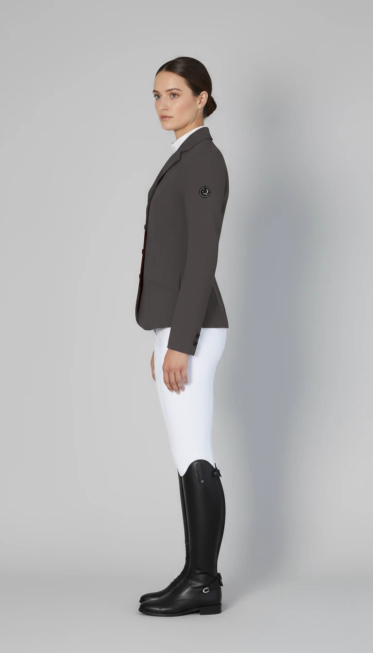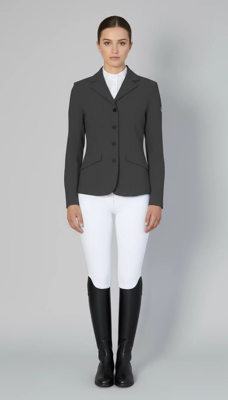 La giacca da concorso Monarchy Grigio di Equus Brand unisce design raffinato e prestazioni tecniche in un capo pensato per le amazzoni che cercano equilibrio tra eleganza e comfort in sella.