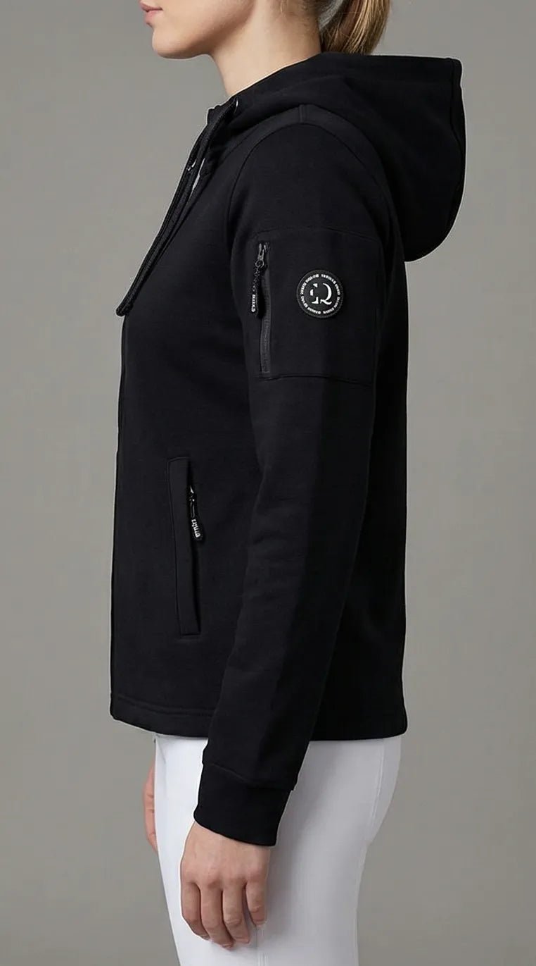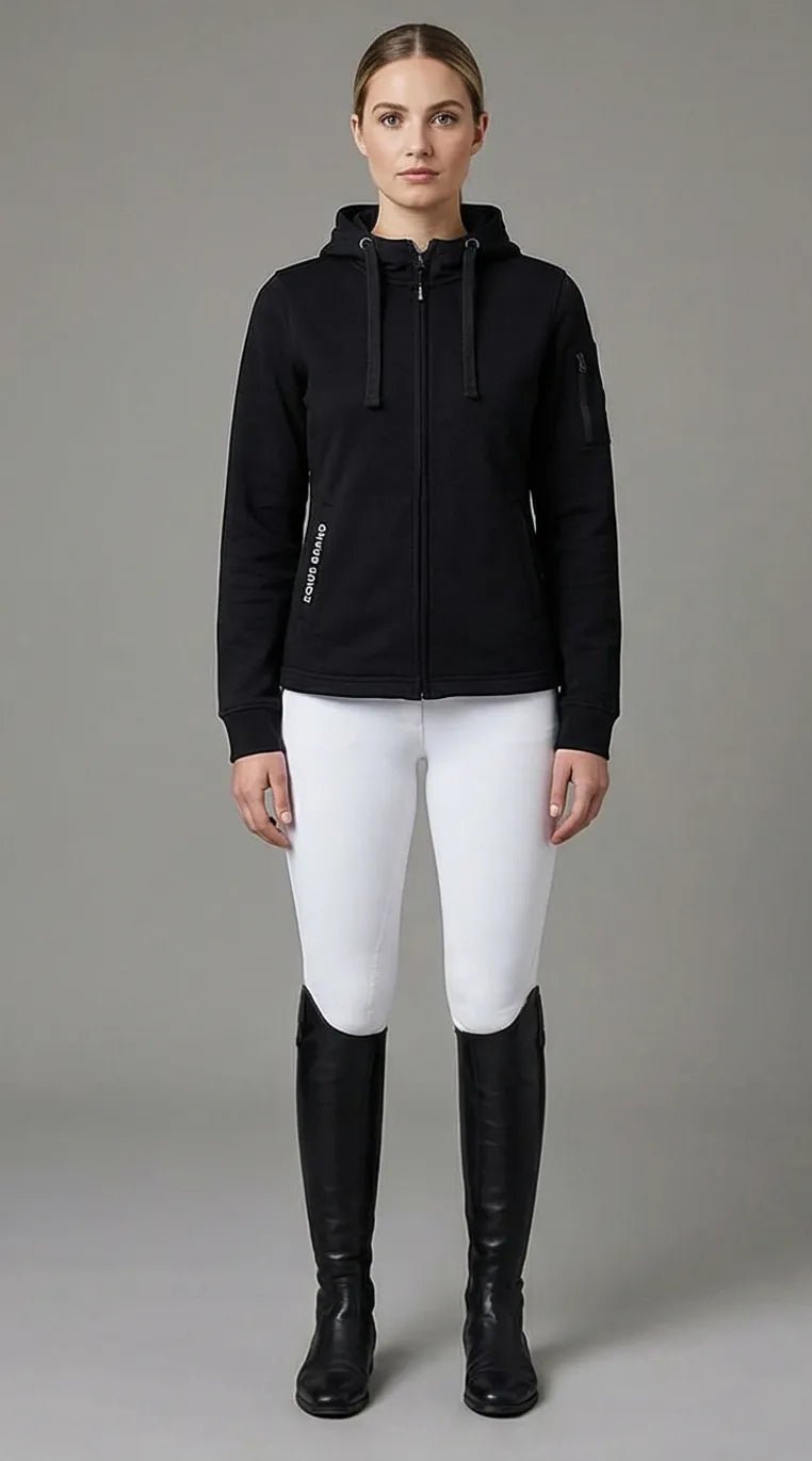 Il nero elegante e senza tempo rende questa felpa estremamente versatile: perfetta in scuderia, durante l’allenamento, nel pre-gara o nel tempo libero. Il taglio femminile valorizza la silhouette senza rinunciare alla praticità, mentre le finiture curate riflettono l’attenzione al dettaglio tipica di EQUUS BRAND.