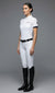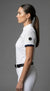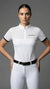 La polo da concorso donna “Maya”, nella versione bianca con bordo blu navy, unisce performance tecnica e sobrietà elegante. Realizzata con tessuto tecnico 4-Way traspirante, collo bianco regolamentare e zip nascosta. Perfetta sotto la giacca da gara.